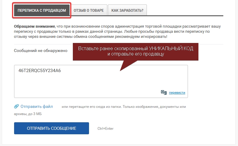 Отправьте скопированный "УНИКАЛЬНЫЙ КОД" продавцу через форму "ПЕРЕПИСКА С ПРОДАВЦОМ" которая располагается в самом низу страницы (см. изображение ниже ⬇️)